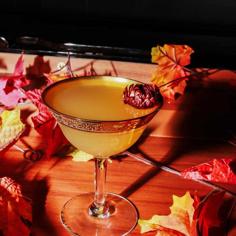 Whiskey and pumpkin spice dance with bright lemon beneath a silky crown of frothy perfection—autumn elegance in a glass.